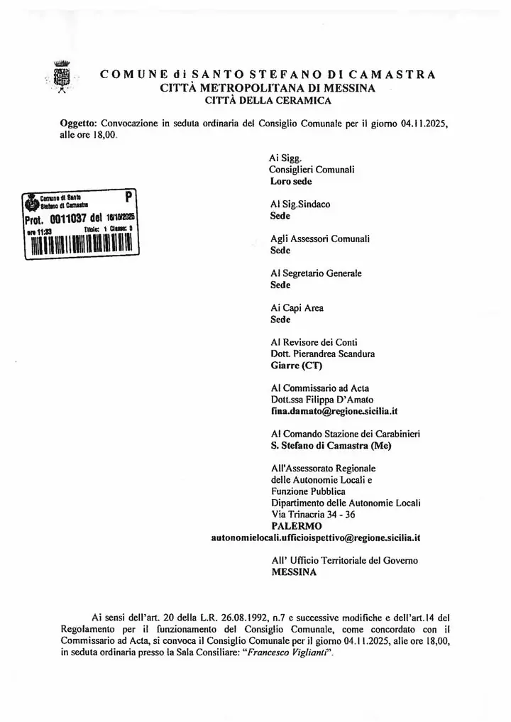 Convocazione Consiglio Comunale in seduta ordinaria per il giorno 4 novembre 2025 alle ore 18:00